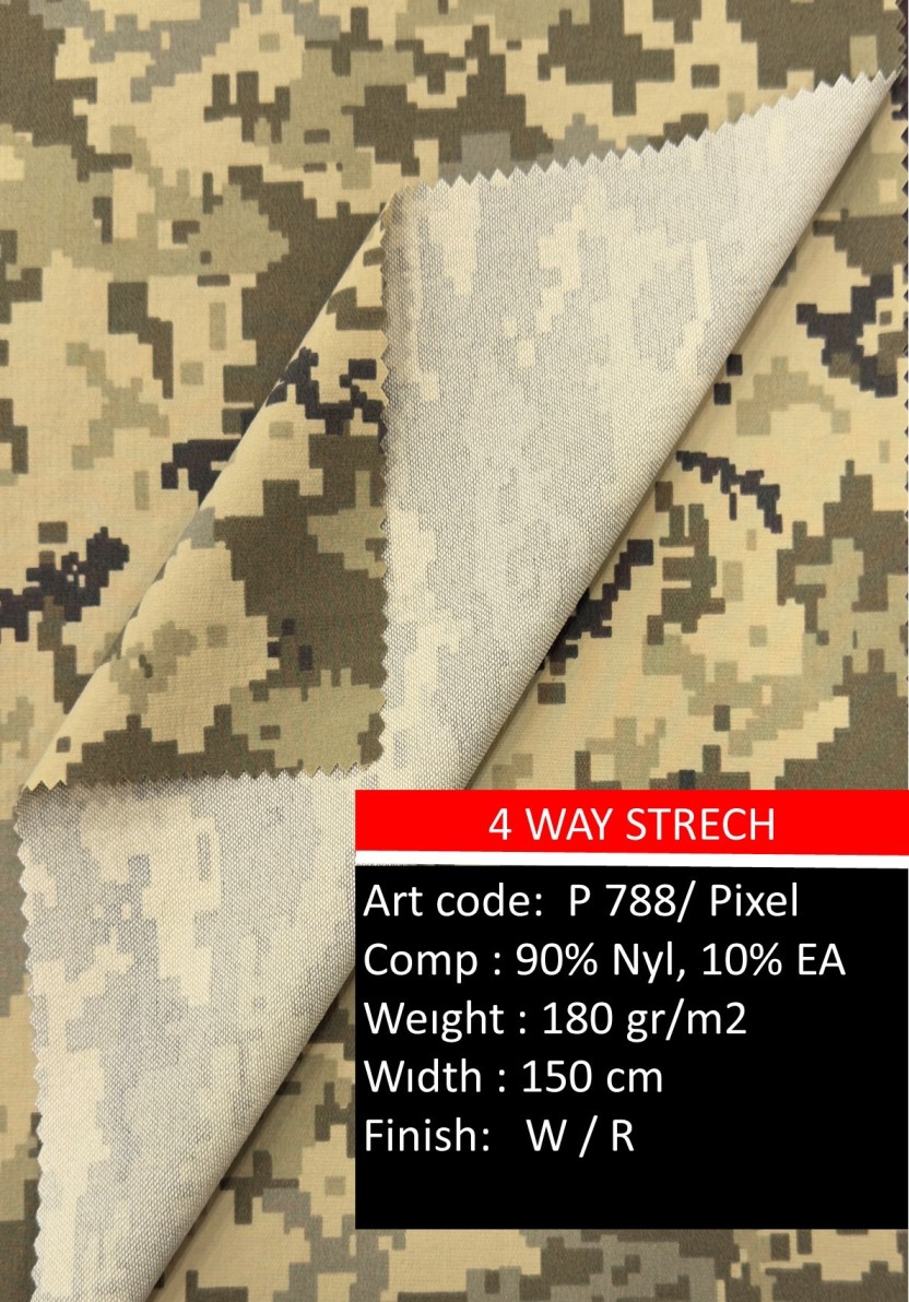 -90%Nylon-10%Elastane ,4 way strech , 180 gr/m2 and various compositions.