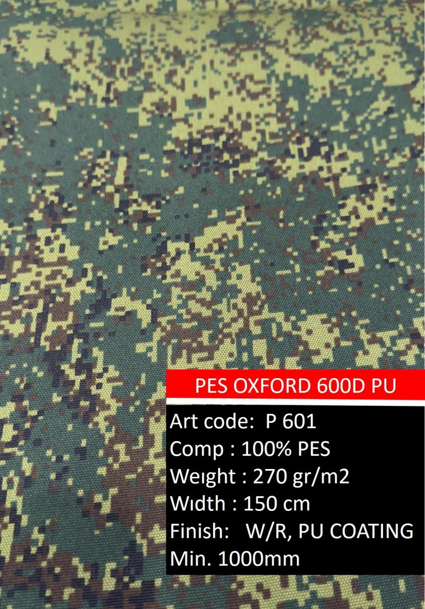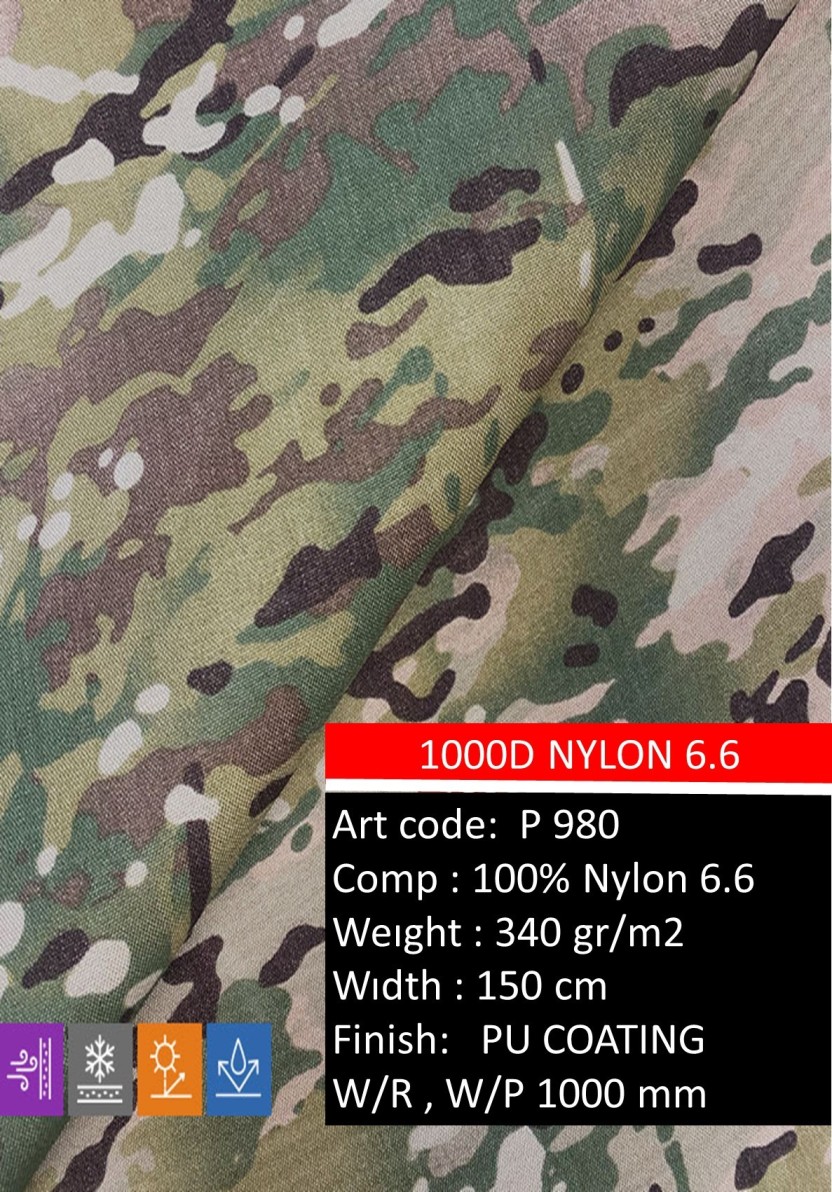 -300D,500D,700D,1000D Nylon 6.6 finished with DWR and Polyurethane coating ( Min.1000mm/H2O)