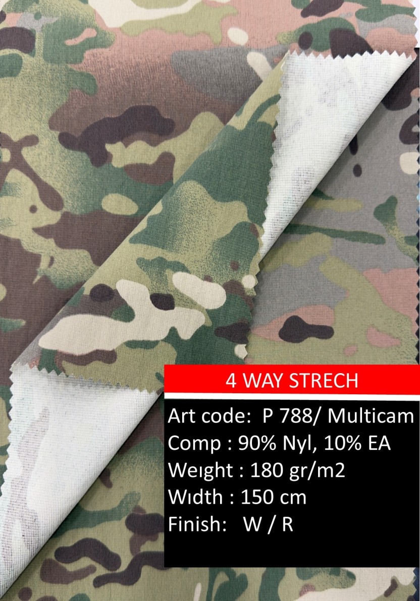 -90%Nylon-10%Elastane ,4 way strech , 180 gr/m2 and various compositions.