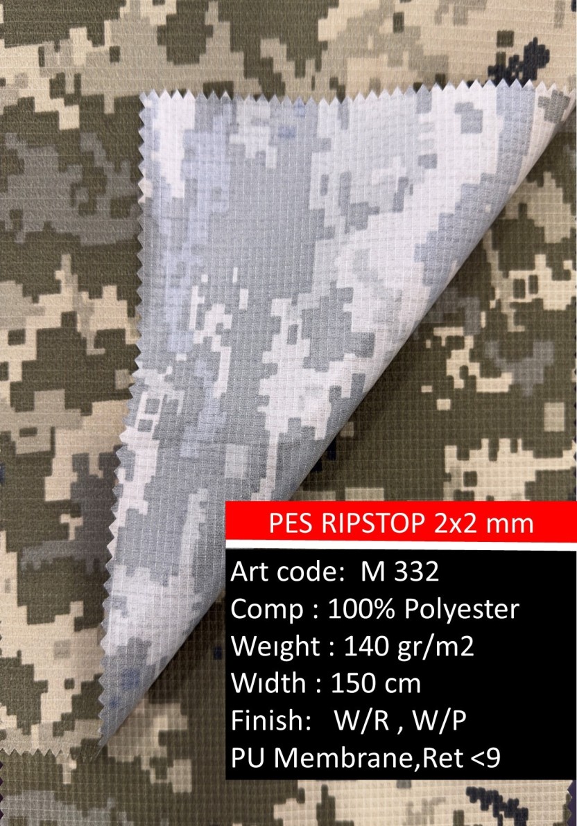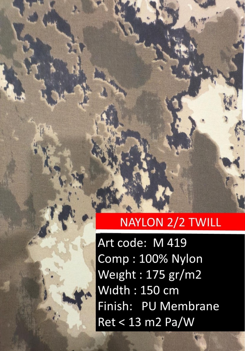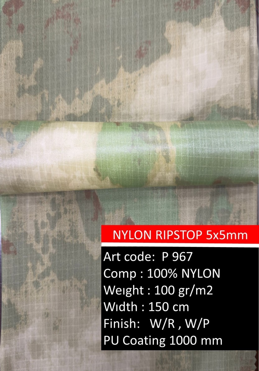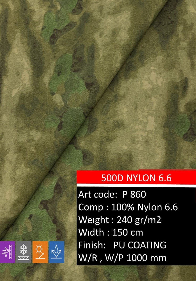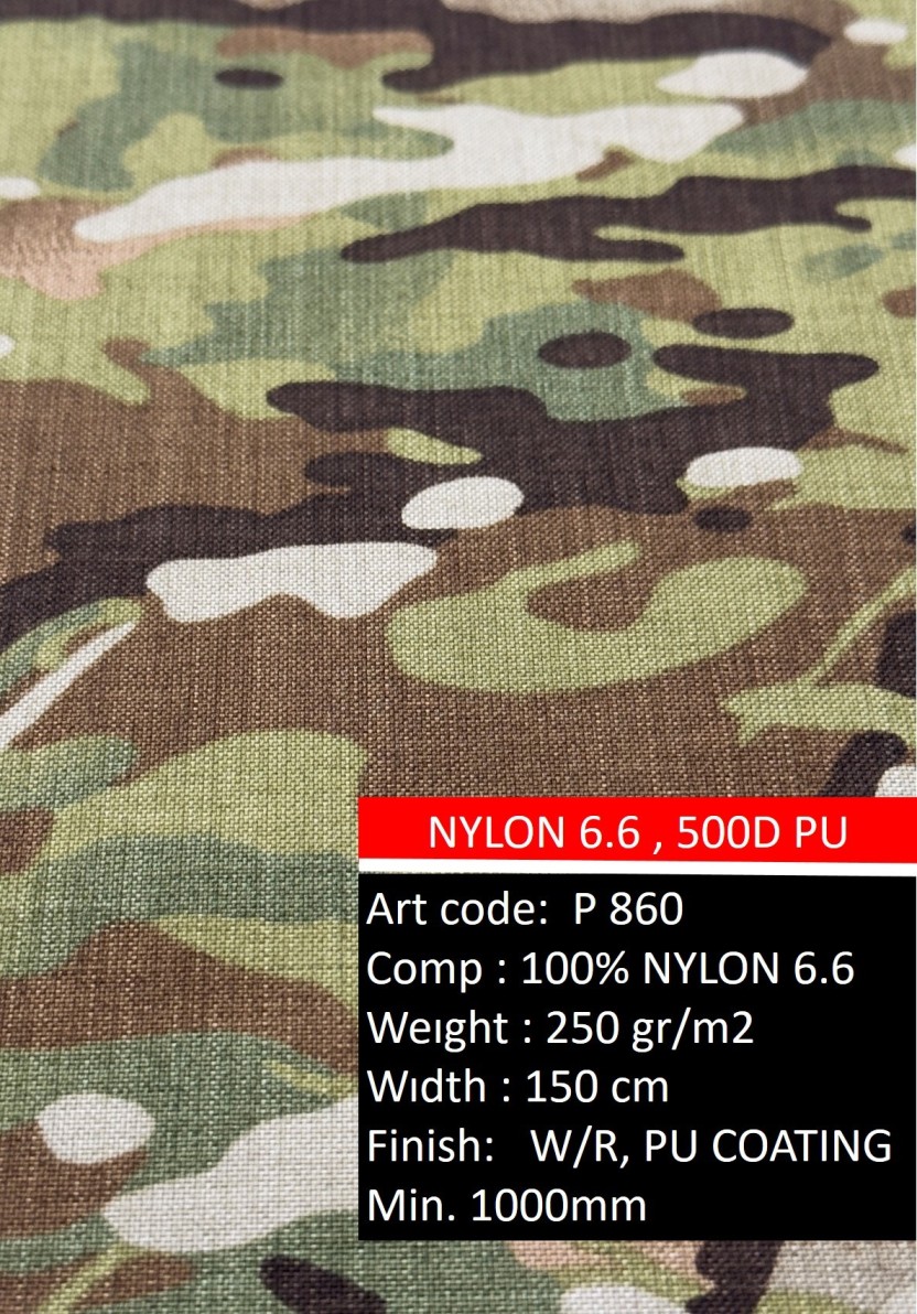 -300D,500D,700D,1000D Nylon 6.6 finished with DWR and Polyurethane coating ( Min.1000mm/H2O)
