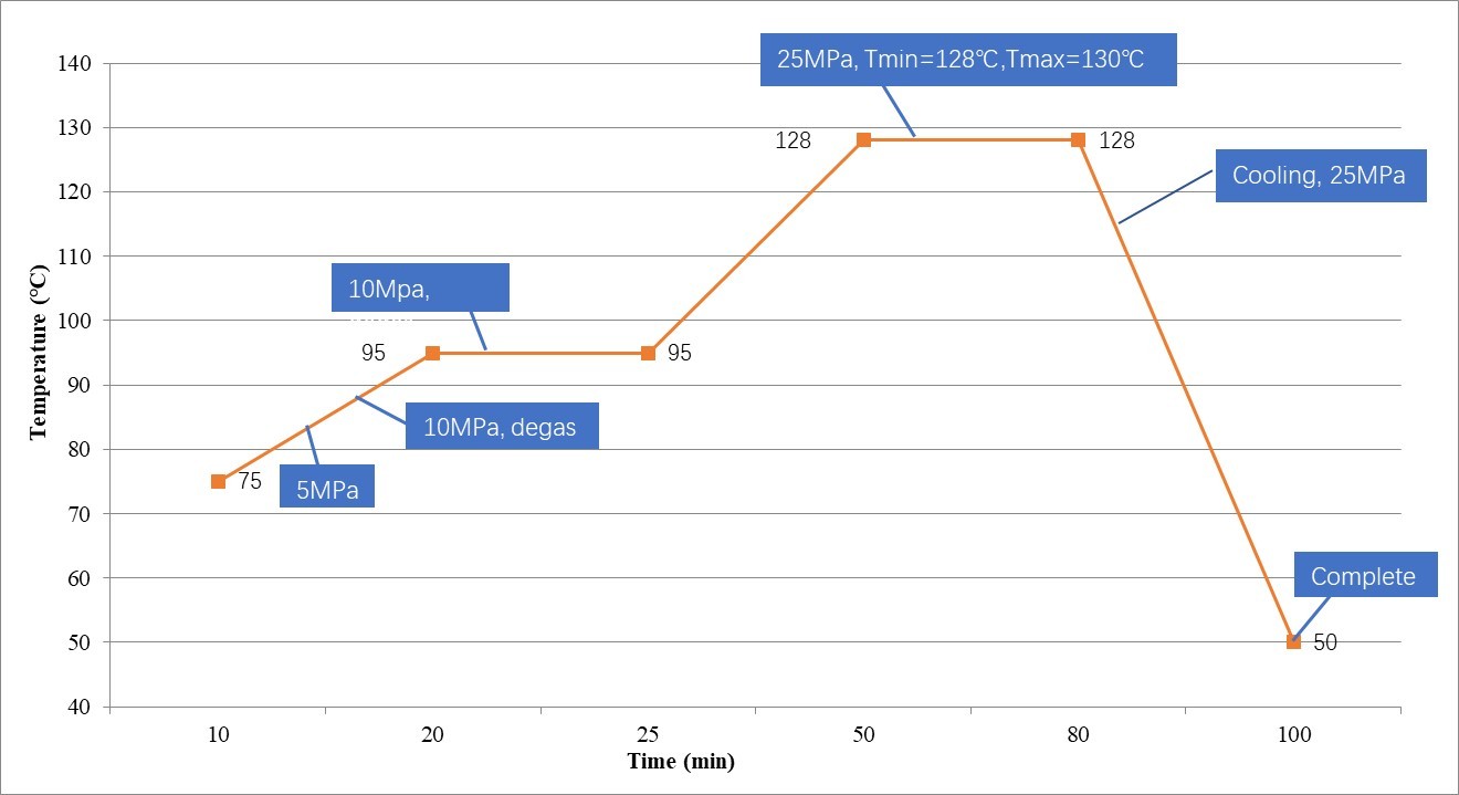 Close the mold and increase the pressure to 25 Mpa while heating up. When the mold temperature rises to 120℃, control the heat ramp slowly for overheat. Ensure the material temperature between 128~130℃, and the material temperature should not exceed 132 ℃. Keep this temperature and 25-Mpa pressure for 25min.